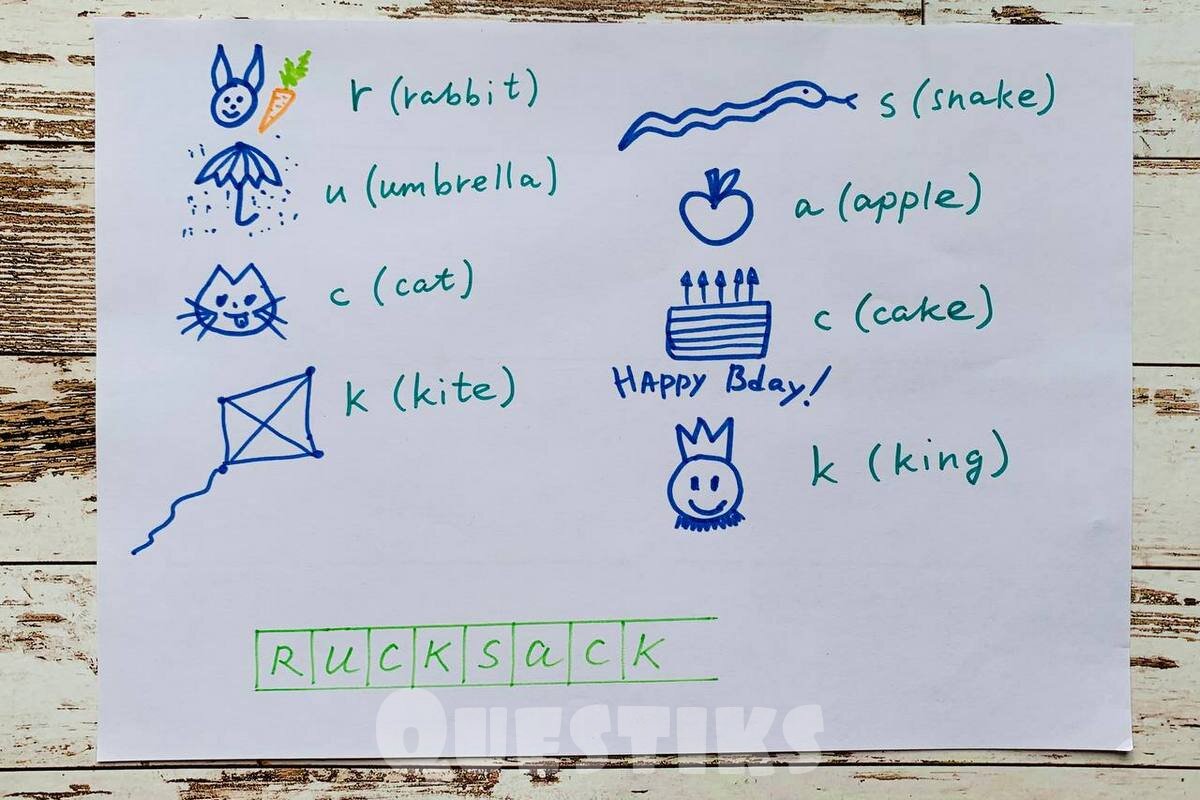 Let's imagine a situation like thar: some friends (5 boys and girls) have gathered to celebrate John’s birthday (he's 8 years old). After tea, John’s mother invites all guests to search their chairs. John saw a piece of paper with a drawn rebus (when inventing rebuses, take into account the children’s age so that they can solve them).