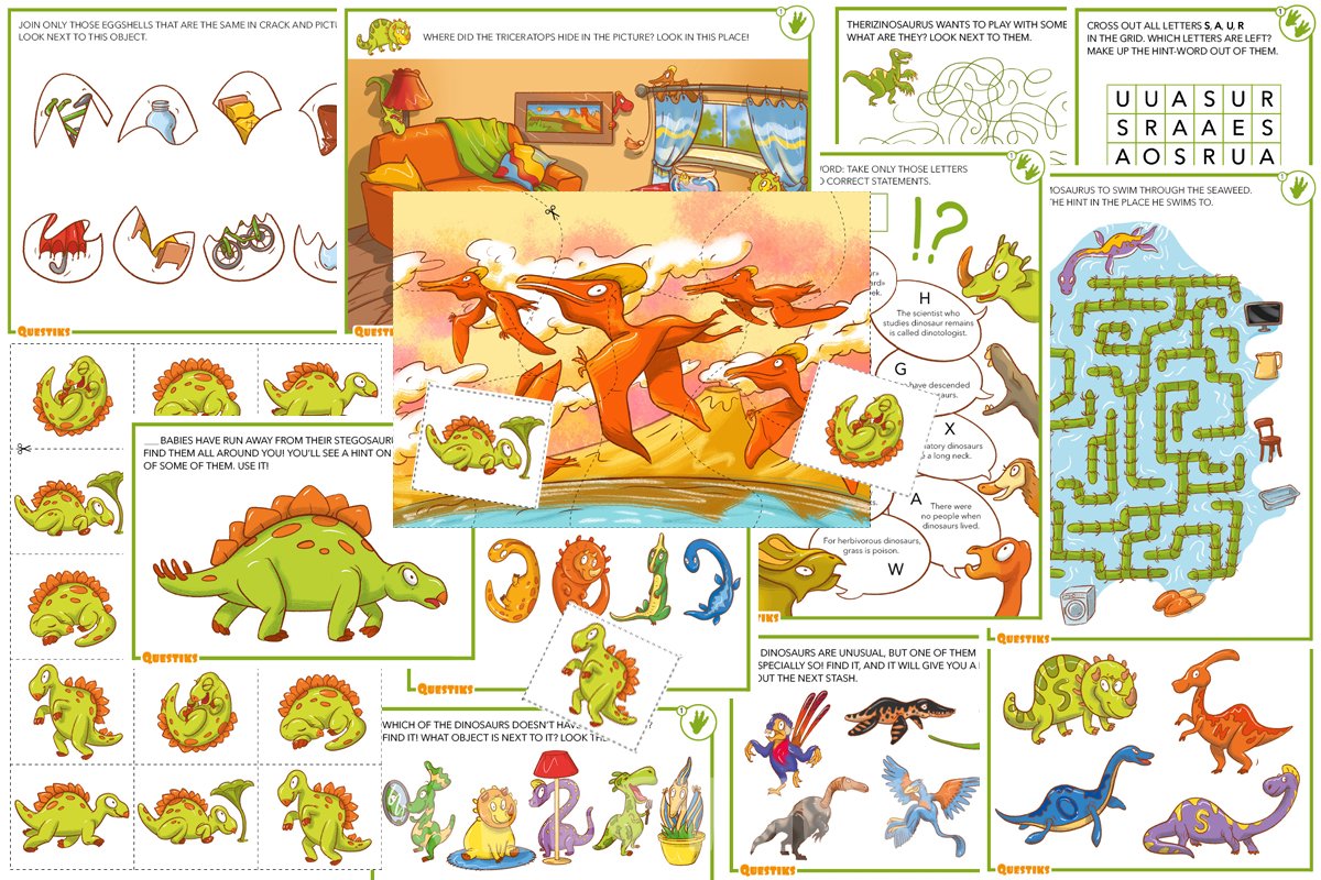 We tried to make this quest very bright and colorful. The design was created by a professional illustrator from our team. See how some of the tasks from the Dinoquest look like: